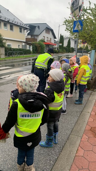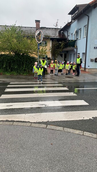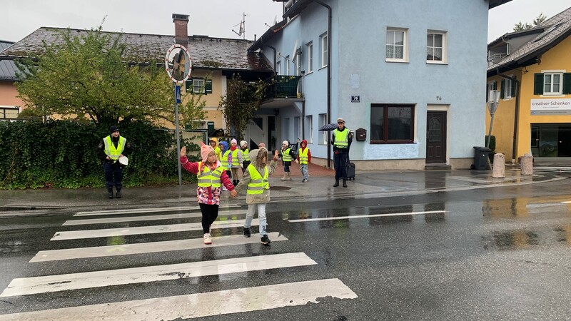 Die Kinder üben das sichere Überqueren der Straße mit Hilfe der Polizei.
